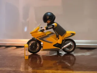 Moto de Playmobil con diseño deportivo. - Color amarillo vibrante. - Incluye figura de piloto con casco. - Detalle de Racer en el lateral. - Se adjunta libro de mantenimiento.