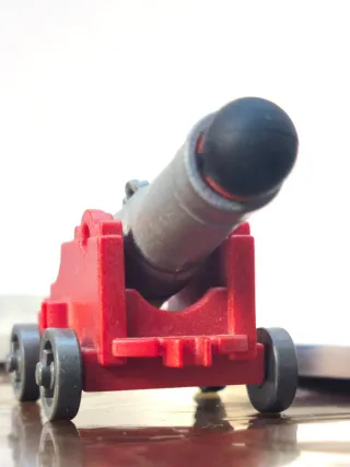 Cañón de juguete de Playmobil. - Base de color rojo. - Cañón de color gris. - Ruedas negras. - Un proyectil.