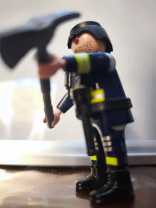 Figura de Playmobil representando a un bombero. Viene con un accesorio de hacha. - Uniforme azul con detalles amarillos. - Chaleco táctico negro.