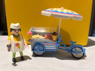 Set de Playmobil que incluye un carrito de helados y una figura. - Carrito de helados con ruedas y parasol. - Figura de vendedor de helados. - Accesorios de helados.