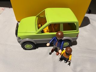 Set de Playmobil que incluye un coche y dos figuras. - Coche de color verde y gris. - Dos figuras de Playmobil con ropa detallada.