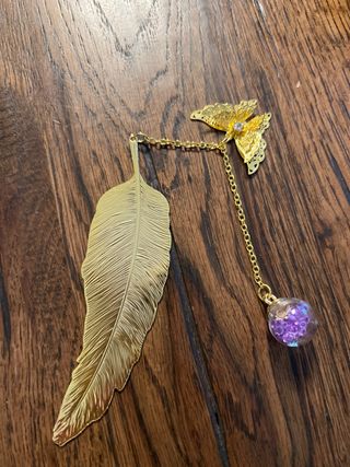 Marcador de libro con diseño de pluma dorada, adornado con una mariposa y un pequeño colgante de cristal con bolitas moradas en su interior. - Diseño elegante de pluma. - Detalle de mariposa. - Colgante de cristal.