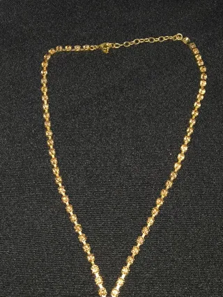 Elegante collar dorado con un diseño delicado y dos colgantes en forma de pluma. La cadena está adornada con pequeñas piedras brillantes. - Cadena fina con incrustaciones. - Colgantes detallados con forma de pluma. - Color dorado.
