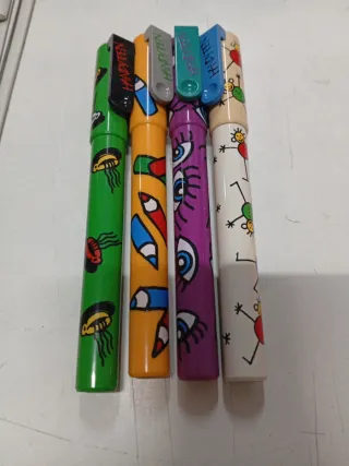 Conjunto de cuatro plumas HANDYPEN de los años 90 con diseños coloridos y divertidos. - Pluma verde con diseño de medusas. - Pluma naranja con diseño de lápices. - Pluma morada con diseño de ojos. - Pluma blanca con diseño de figuras. Cada una vale 4€