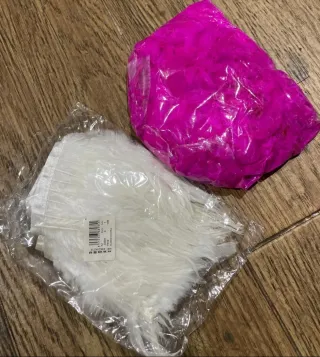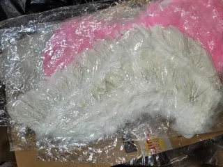 Conjunto de alas y plumas decorativas en tonos blanco y rosa, con detalles plateados. - Plumas blancas suaves. - Plumas rosas vibrantes. - Hilos plateados integrados para un toque brillante.