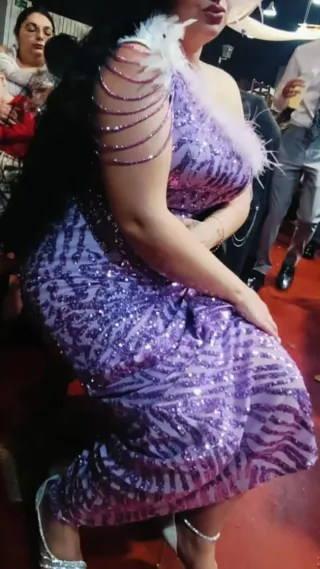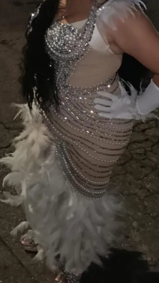 Elegante vestido de fiesta largo, con un diseño llamativo y sofisticado. - Cuerpo del vestido adornado con pedrería plateada. - Falda con detalles de plumas blancas. - Guantes blancos a juego incluidos.