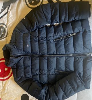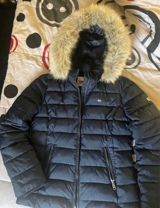 Chaqueta acolchada Tommy Hilfiger, de mujer, con relleno de plumón en color azul marino. 100% nailon, forro de poliéster. - Cierre de cremallera. - Bolsillos con cremallera. - Repele el agua. - Cálida capucha con acabado de pelo sintético, extraíble, - Logo de Tommy Jeans bordado en frontal y manga. - Talla M, pero talla pequeño, es una S-M. Queda entallado. - Precio original 199 euros. - Un año de uso con pocas puestas, está como nuevo