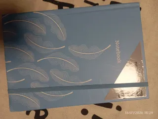 Libreta de tapa dura azul con un diseño de plumas blancas. - Cubierta con estampado de plumas. - Goma elástica para mantenerla cerrada. - Texto Notebook en la cubierta.