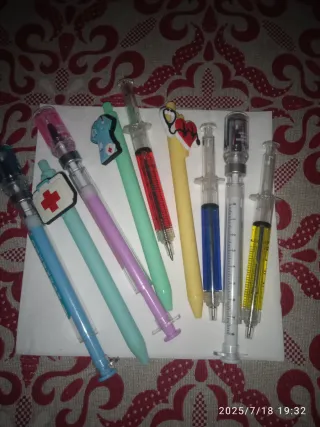 bolígrafos con un diseño original en forma de llaves, plumas jeringuillas,goteros,pintalabios,etc...No dudes en preguntarme últimas unidades
