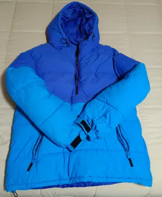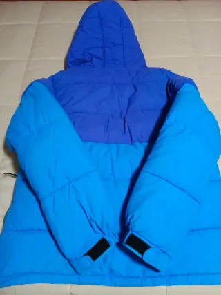 Chaqueta de plumas sintéticas con capucha. - Diseño bicolor en azul y celeste. - Cremallera frontal. - Bolsillos laterales con cremallera. - Puños ajustables con velcro. -Aberturas con cremalleras laterales