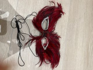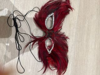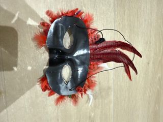 Máscara decorativa con plumas rojas y detalles brillantes. Perfecta para disfraces o eventos. - Plumas de color rojo intenso. - Adornada con pedrería plateada. - Incluye cordones negros para sujetar.