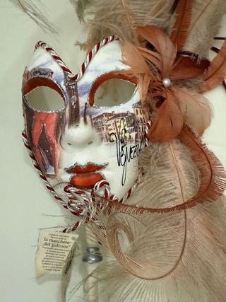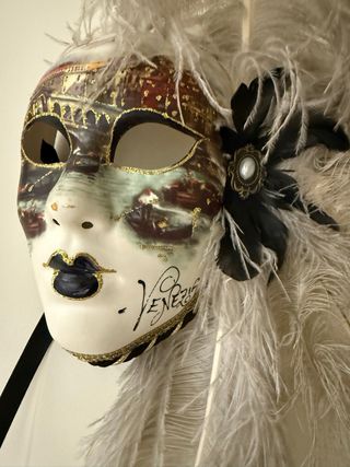 Máscara veneciana decorativa, ideal para colgar y dar un toque de elegancia. - Diseño con detalles pintados a mano. - Adornada con plumas grises. - Acabado con borde trenzado.