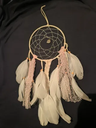 Precioso atrapasueños artesanal, perfecto para decorar cualquier espacio. - Aro principal de mimbre. - Tejido interior de red. - Cuentas de madera. - Plumas blancas. - Tiras de encaje rosa y beige. -medida 40cnt aproximada mente