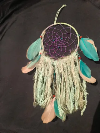 Atrapasueños decorativo con un diseño artesanal. - Aro morado con red tejida. - Adornado con plumas en tonos turquesa y rosa pálido. - Cuentas azules y rojas. - Flecos de encaje y tela en color menta y blanco. -40 cnt aproximada mente