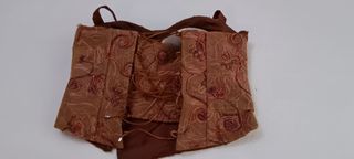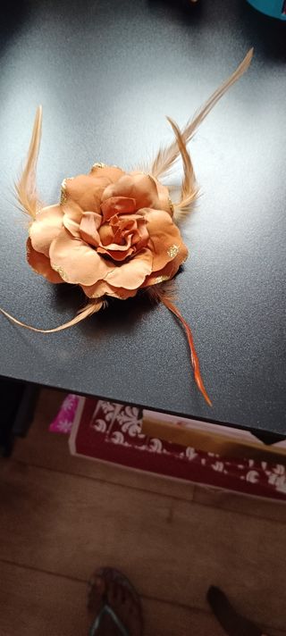 Adorno de flor de tela en tono melocotón, con detalles dorados en los bordes de los pétalos y adornada con plumas. - Diseño floral elegante. - Acentos de purpurina dorada. - Incorpora plumas de diferentes tamaños. Corpiño y falda larga. Zapatos 38. Bolso a juego.