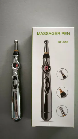 Pluma de acupuntura modelo DF-618. - Diseño ergonómico y plateado. - Pantalla digital para niveles de intensidad. - Incluye diferentes cabezales para diversas aplicaciones.