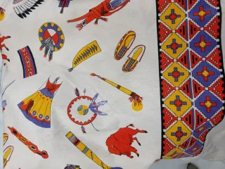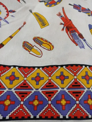 Tela con un diseño inspirado en motivos nativos americanos, incluyendo figuras de indios, plumas y símbolos -tejido de esterilla fina en poliéster y algodón con cenefa en un lateral Ancho 1.55*1 metro=6euros posibilidad de más metros o de 050 cm hacemos anuncio a medida necesaria de las telas que más le gusten