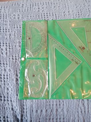 estuche nuevo con regla, escuadra, cartabón etc + tres reglas de regalo (última foto)