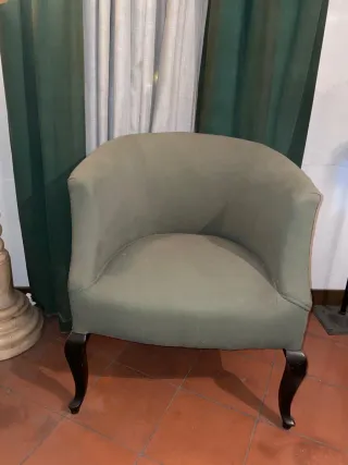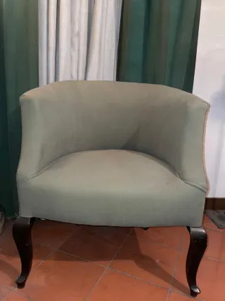 Elegante pareja de sillones tapizados en un suave color verde. Su diseño curvo y patas de madera oscura le dan un toque clásico. Antiguos vintage - Tapicería de tela. - Patas de madera oscura.