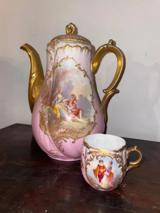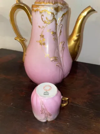Precioso juego de té de porcelana con delicados detalles pintados a mano. Incluye tetera y taza. - Diseño con escenas románticas. - Acabado en rosa pálido. - Bordes y detalles dorados. - Marca: Limoges Recogida en Barcelona