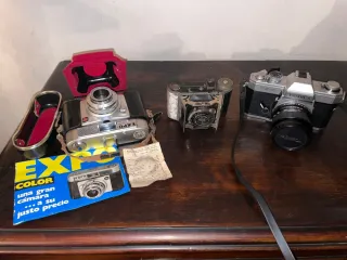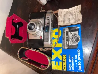Conjunto de tres cámaras fotográficas antiguas, perfectas para coleccionistas o amantes de la fotografía retro. - Cámara EXPO con funda de cuero. - Cámara plegable vintage. - Cámara Yashica FX-2 con objetivo. - Incluye exposímetro y folleto EXPO COLOR. Precio negociable y recogida en Barcelona.