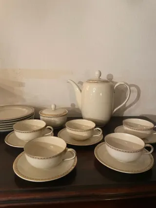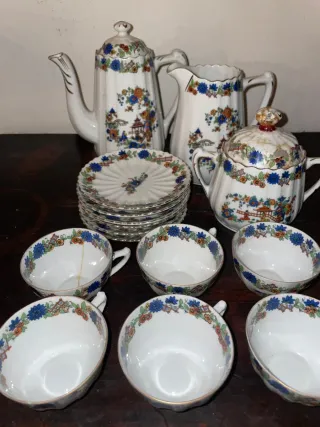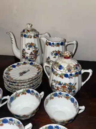 Conjunto de porcelana vintage con un bonito diseño floral y de pagodas. - Tetera - Jarra de leche - Azucarero - 6 platos - 6 tazas Precio negociable Recogida en Barcelona