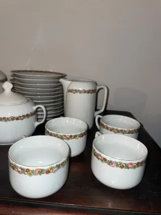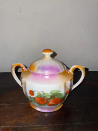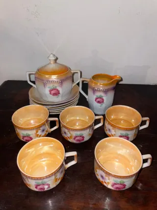 Conjunto de porcelana vintage con un diseño floral delicado. - Incluye azucarero, lechera y cinco tazas. - Acabado nacarado en tonos naranjas y morados. - Decoración de rosas y flores pequeñas.