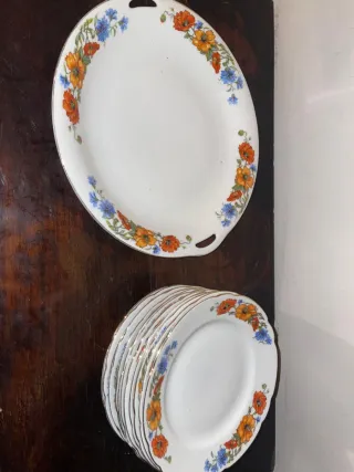 Conjunto de vajilla con un bonito diseño floral. - Plato grande decorado con flores naranjas y azules. - Juego de platos pequeños apilados.
