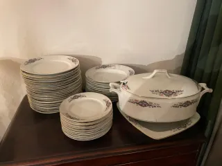 Elegante juego de vajilla de porcelana con un delicado diseño floral y borde dorado. Ideal para ocasiones especiales o para añadir un toque clásico a tu mesa. - Incluye fuente grande con tapa. - Varias fuentes y platos. - Diseño floral con detalles en rosa, azul y dorado.