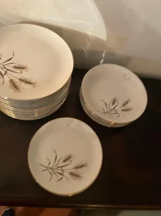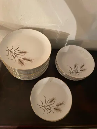 Conjunto de platos de porcelana con un delicado diseño de espigas y borde dorado. - Diseño de espigas en tonos marrones. - Borde con detalle dorado. - Porcelana de alta calidad.