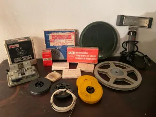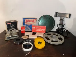 Conjunto de accesorios para cine Super 8, ideal para amantes del formato. - Empalmadora de cemento 3-Way. - Carrete de película de 8mm. - Dos carretes de película amarillos. - Un carrete de película negro. - Caja de letras adhesivas para títulos. - Tubo de pegamento para cine Cinecol. - Caja de Rotulo para principio y final. - Lámpara de iluminación para cine.