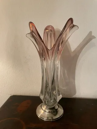 Elegante jarrón de cristal con base de plata. Su diseño escultural y el degradado de color rosa le dan un toque sofisticado. - Material: Cristal y plata. - Color: Rosa y transparente. - Diseño escultural.