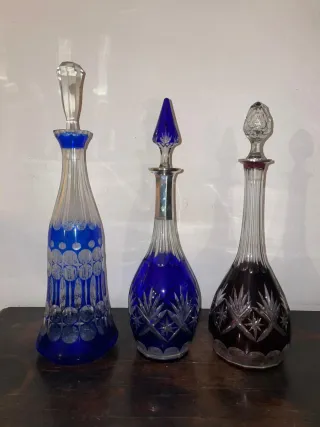 Conjunto de tres decantadores de cristal tallado con detalles en azul. Piezas vintage con un diseño elegante. - Decantador de cristal transparente con detalles azules. - Decantador de cristal azul con tallado. - Decantador de cristal con líquido tallado.