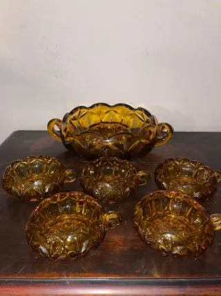 Conjunto Bol grande y bol pequeño de cristal tallado en un hermoso color ámbar. Perfectas para añadir un toque vintage a tu mesa. Típicas para poner macedonia en la mesa. - Diseño con tallado intrincado. - Color ámbar vibrante. - Material: Cristal.