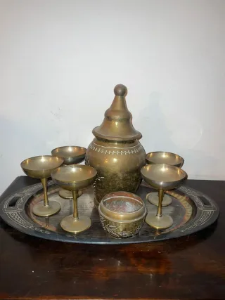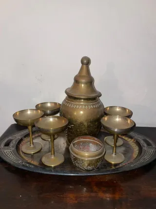 Conjunto de piezas de latón con un diseño antiguo y decorativo. - Jarra con tapa y detalles grabados. - Seis copas con base. - Un pequeño cuenco decorativo. - Bandeja redonda con grabados.