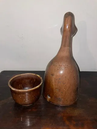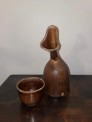 Conjunto de dos piezas de cerámica en tono marrón. Incluye una jarra con forma de pato y un cuenco. - Jarra con pico pronunciado. - Cuenco de tamaño mediano. - Acabado brillante.