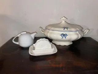 Elegante juego de vajilla de cerámica blanca con detalles en azul. - Incluye tetera. - Incluye sopera con tapa. - Incluye servilletero con diseño floral.