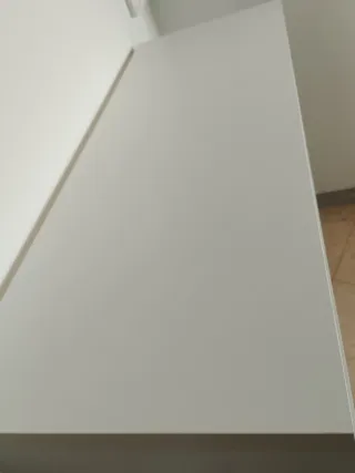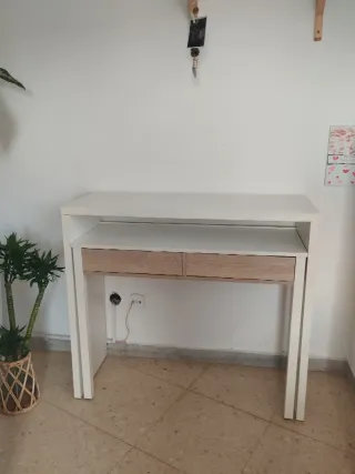 Escritorio moderno con un diseño funcional y elegante. Perfecto para espacios reducidos. - Acabado en blanco y madera clara. - Dos cajones integrados para almacenamiento. - Patas delgadas y estilizadas.