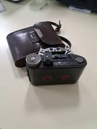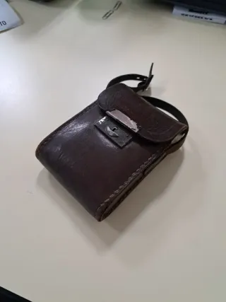Funda de cuero para cámara antigua. - Diseño clásico y elegante. - Cierre de seguridad metálico. - Correa ajustable.