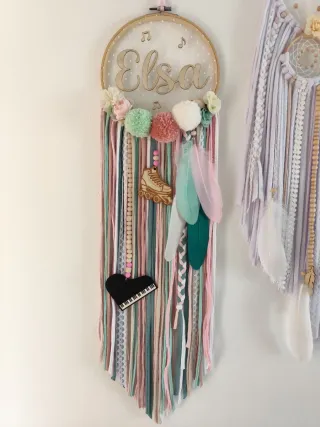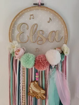 Precioso atrapasueños personalizado con el nombre 'Elsa'. Ideal para decorar una habitación infantil. - Aro de madera con detalles pintados. - Nombre 'Elsa' en madera. - Adornos de pompones, flores y plumas. - Figura de piano en forma de corazón. - Incluye patín de madera.