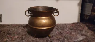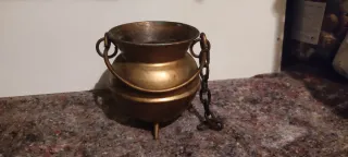 Posibles usos: Decoración: El uso más común. Se utilizan mucho en chimeneas o cocinas de estilo vintage. Quemador de incienso: Debido a sus patas (que lo elevan del suelo para no quemar la superficie) y su asa/cadena, se suelen usar para quemar resinas o incienso en grano. Macetero: A veces se utilizan para colocar plantas pequeñas. Uso ritual: En algunas tradiciones se usan en altares.