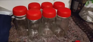 Set de siete botes de cristal con tapas de plástico rojas. - Todos a 9€. - Botes de cristal transparentes. - Tapas de plástico de color rojo.