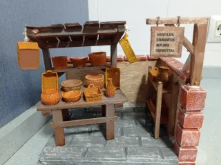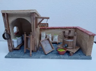Detalle de panadería o forn para belén o pesebre. - Construcción rústica con piedras. - Techo de madera. - Incluye accesorios como panes y tinajas.