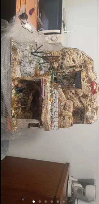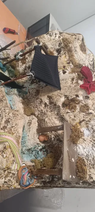 Estructura artesanal portal de Belén. Ideal para crear un ambiente tradicional de cartón piedra. Tiene bomba de agua y luces led. En muy buen estado. - Diseño de portal con rocas y detalles. - Incluye accesorios decorativos. Largo : 65 Ancho : 36 Alto : 60 Peso : casi 2 Kilos