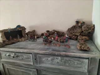 Conjunto de figuras y elementos para montar un portal de Belén. - Figuras de Reyes Magos a caballo. - Figuras de personas y animales. - Estructura de corcho para el portal. - Elementos decorativos de corcho imitando rocas y ruinas.