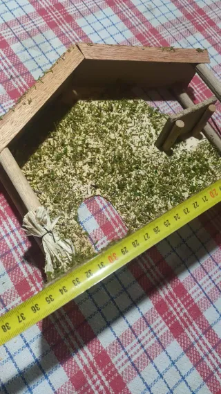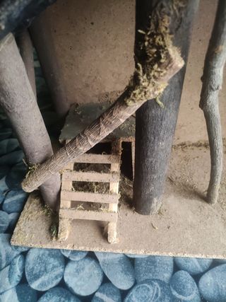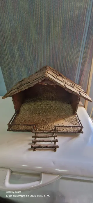 Casita artesanal para pesebre, ideal para crear tu propio belén. - Estructura de madera con tejado de corteza. - Relleno de serrín y paja. - Escalera de ramas.