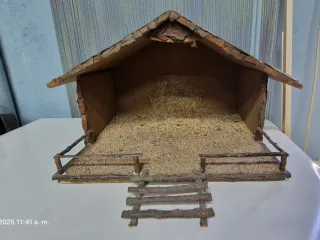 Portal de belén con acabado rústico, ideal para crear tu propio pesebre. - Base de madera con serrín. - Techo de corteza de árbol. - Estructura de madera.