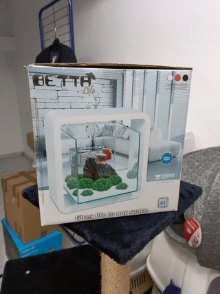 Acuario de diseño moderno para peces Betta. - Capacidad de 5 litros. - Marco blanco. - Incluye decoración.