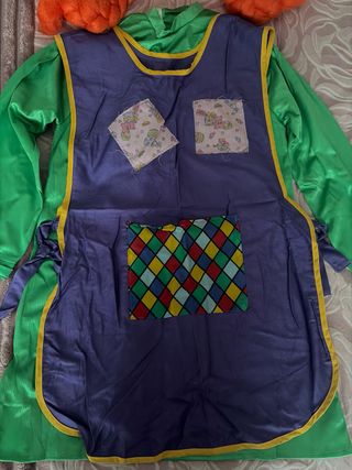 Disfraz completo de Pipi Calzaslargas, perfecto para fiestas o carnaval. - Peluca naranja con coletas. - Vestido verde con delantal morado. - Calcetines a rayas.