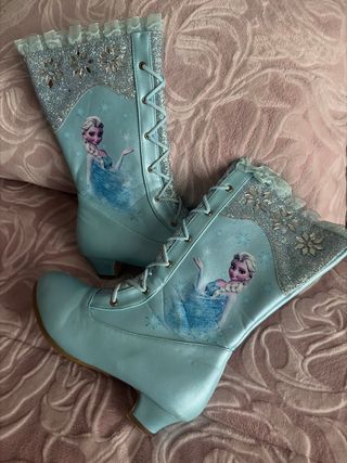 Botas inspiradas en el personaje de Elsa de Frozen. Perfectas para fans de la película. - Diseño con imagen de Elsa. - Detalles brillantes y encaje. - Adorno de encaje en la parte superior. - Tacón bajo.
